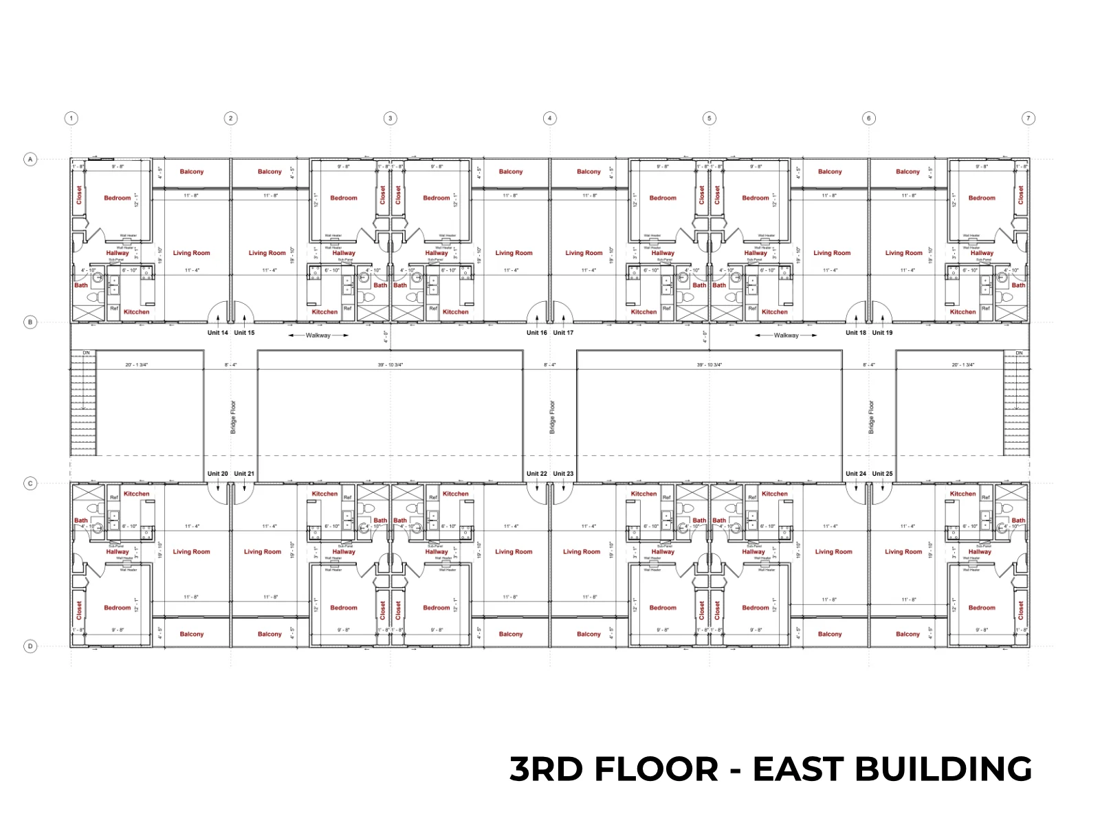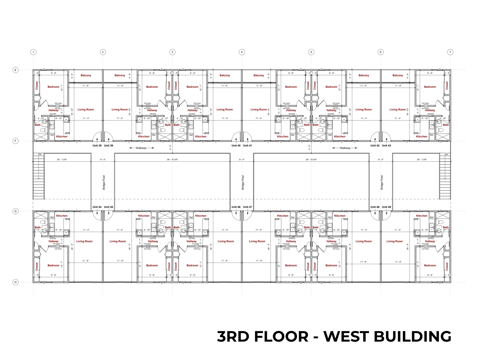 Two three-story residential buildings connected by bridge walkways, comprising 49 one-bedroom units across the 2nd and 3rd floors. Full field verification of all unit layouts, common corridors, walkway bridges, and site. Both east and west buildings documented floor by floor.