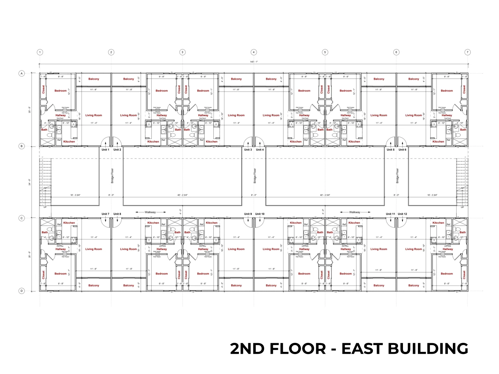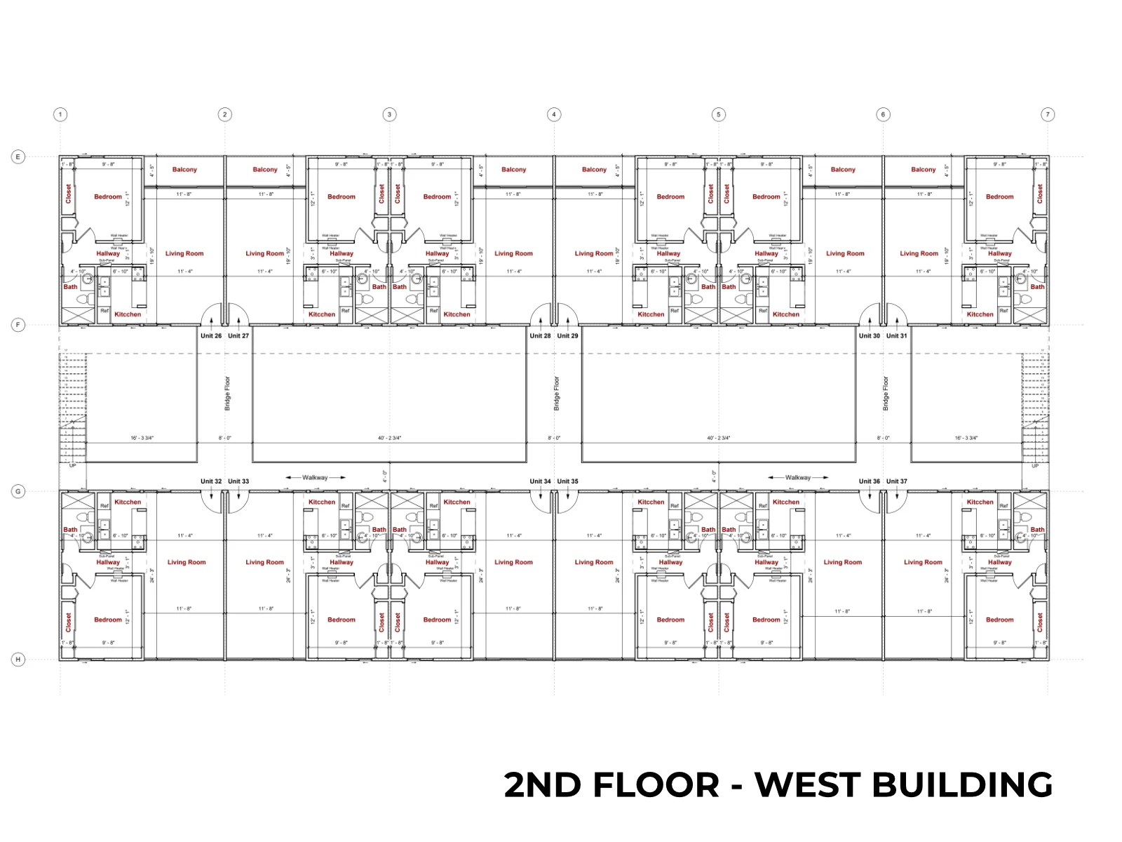 Individual unit layouts with dimensions · Bridge walkway and common area documentation
