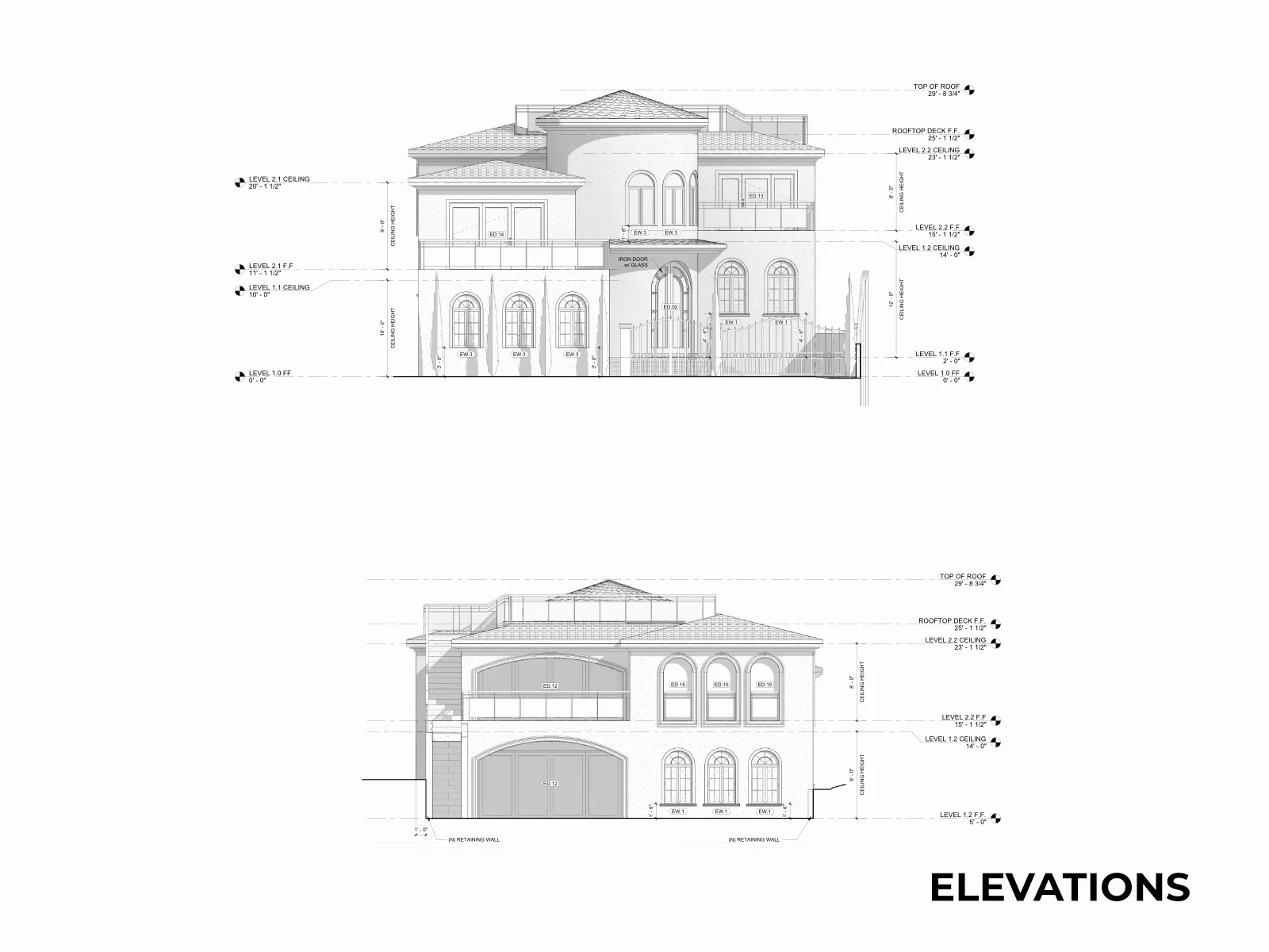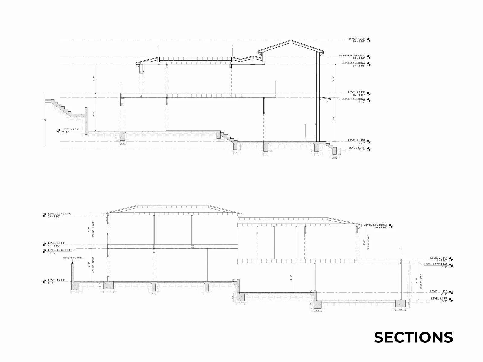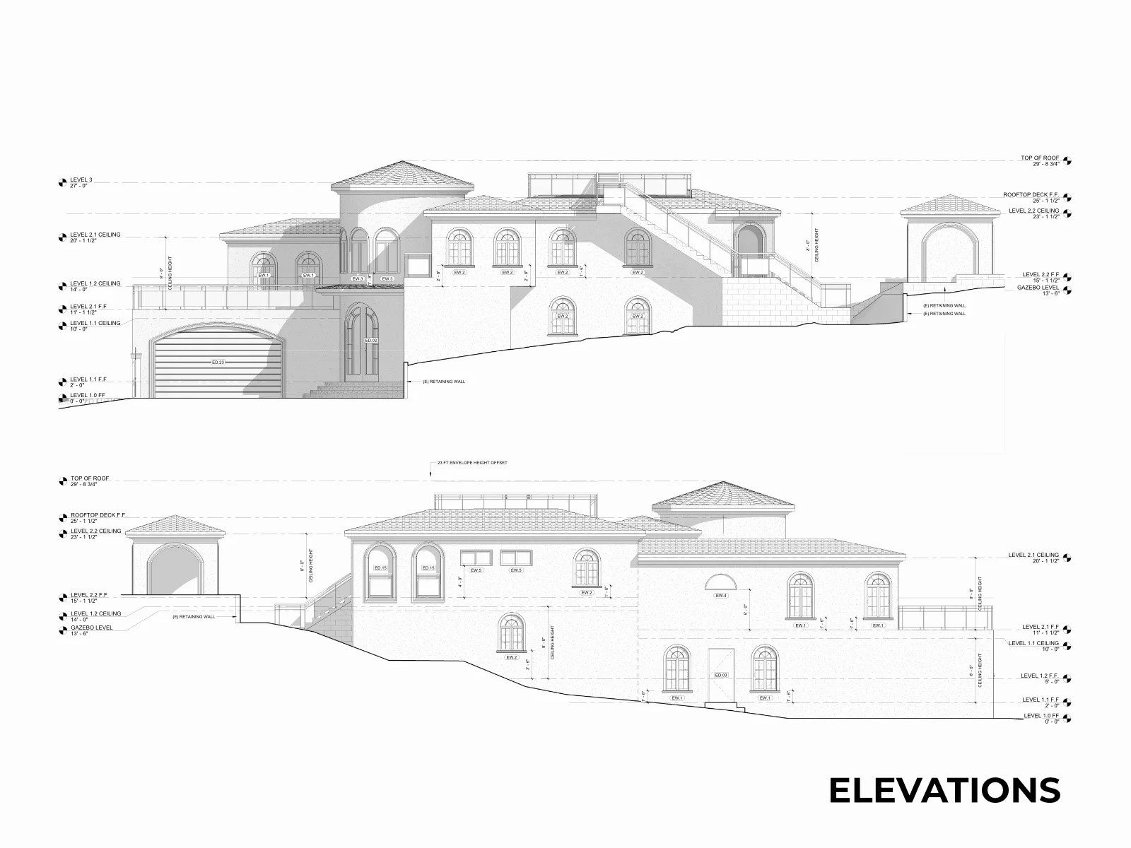 A 4,000+ SF hillside estate, fully documented. Two stories, three split levels, a circular rotunda, JADU studio, and every accessory structure captured in a complete as-built drawing set.
